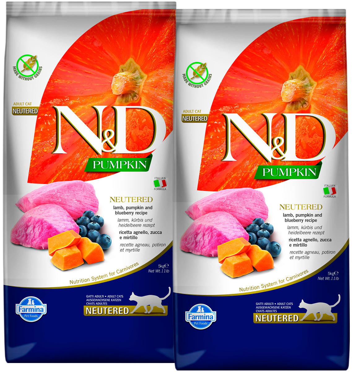 Сухой корм для кастрированных котов и стерилизованных кошек FARMINA N&D GRAIN FREE PUMPKIN NEUTERED беззерновой ягненок, черника, тыква (5 + 5 кг)