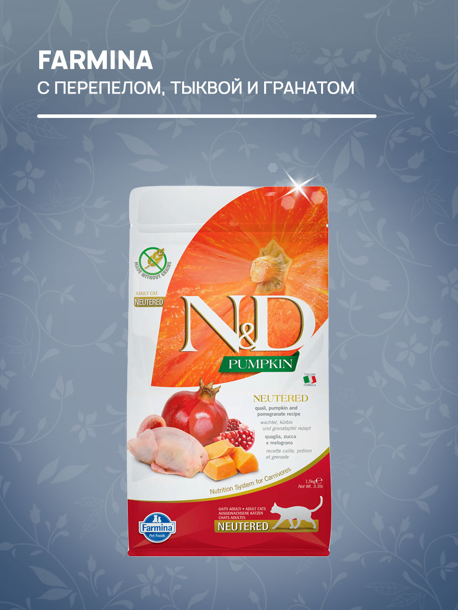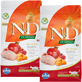 Сухой корм для кастрированных котов и стерилизованных кошек FARMINA N&D GRAIN FREE PUMPKIN NEUTERED беззерновой перепел, тыква, гранат (1,5 + 1,5 кг)