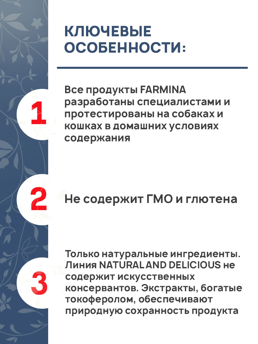 - Все продукты FARMINA разработаны специалистами и протестированы на собаках и кошках в домашних условиях содержания