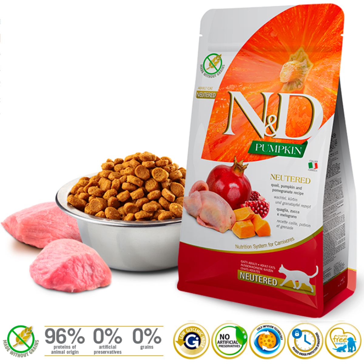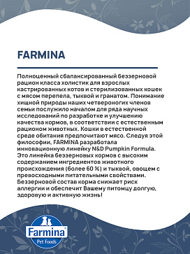 Понимание хищной природы наших четвероногих членов семьи послужило началом для ряда научных исследований по разработке и улучшению качества кормов, в соответствии с естественным рационом животных. Кошки в естественной среде обитания предпочитают мясо. Следуя этой философии, FARMINA разработала инновационную линейку N&D Pumpkin Formula. Это линейка беззерновых кормов с высоким содержанием ингредиентов животного происхождения (более 60 %) и тыквой, овощем с превосходными питательными свойствами.