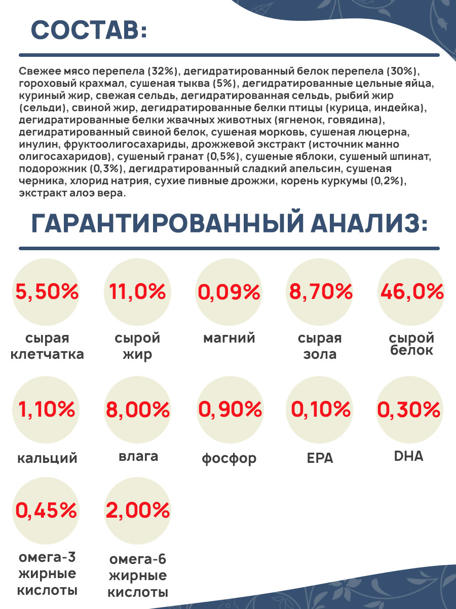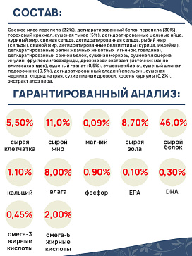 Свежее мясо перепела (32%), дегидратированный белок перепела (30%), гороховый крахмал, сушеная тыква (5%), дегидратированные цельные яйца, куриный жир, свежая сельдь, дегидратированная сельдь, рыбий жир (сельди), свиной жир, дегидратированные белки птицы (курица, индейка), дегидратированные белки жвачных животных (ягненок, говядина), дегидратированный свиной белок, сушеная морковь, сушеная люцерна, инулин, фруктоолигосахариды, дрожжевой экстракт (источник маннoолигосахаридов), сушеный гранат (0,5%), сушеные яблоки, сушеный шпинат, подорожник (0,3%), дегидратированный сладкий апельсин, сушеная черника, хлорид натрия, сухие пивные дрожжи, корень куркумы (0,2%), экстракт алоэ вера.