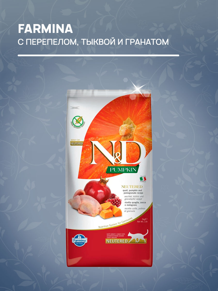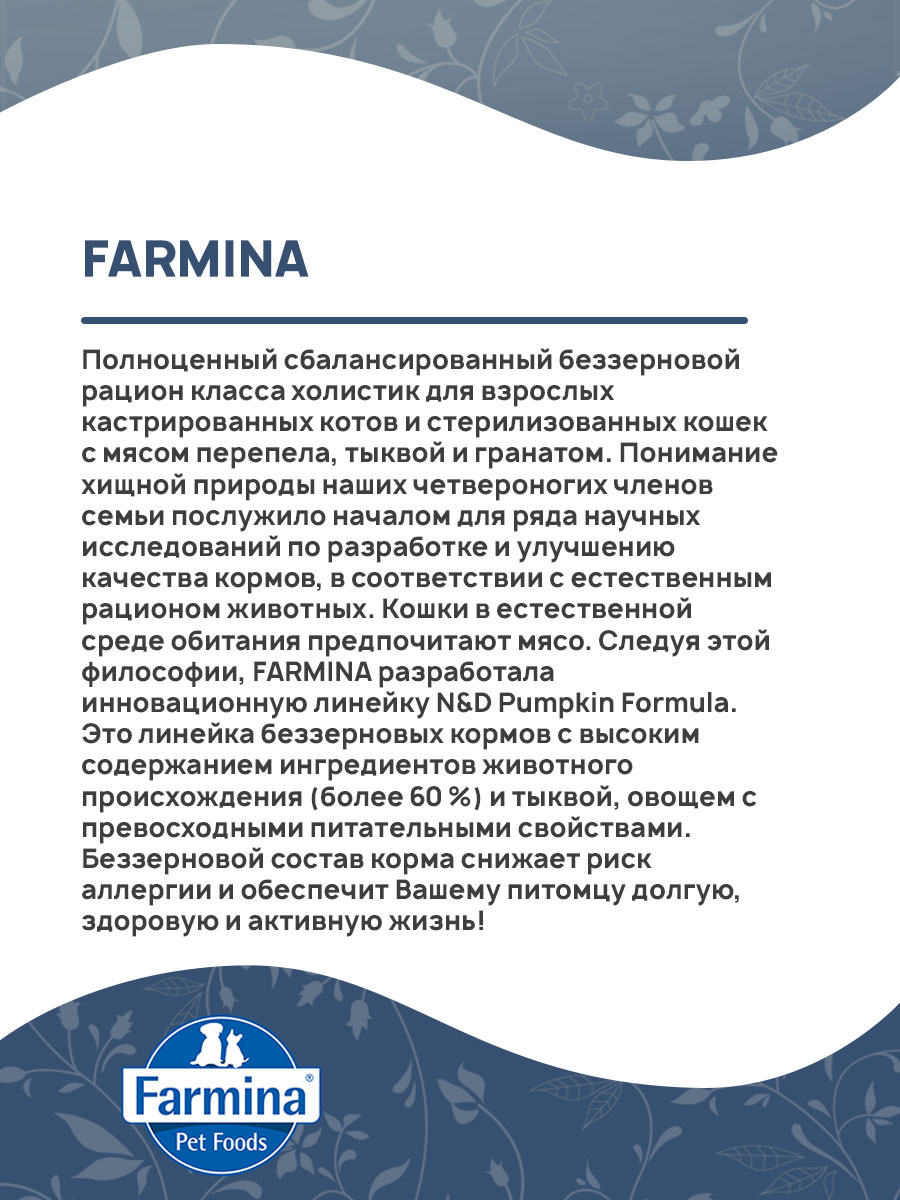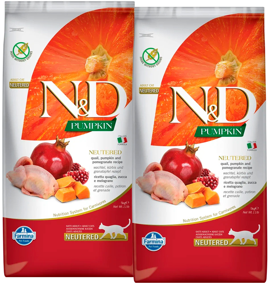 Сухой корм для кастрированных котов и стерилизованных кошек FARMINA N&D GRAIN FREE PUMPKIN NEUTERED беззерновой перепел, тыква, гранат (5 + 5 кг)