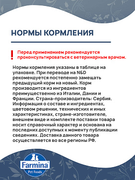 Нормы кормления указаны в таблице на упаковке. При переводе на N&D рекомендуется постепенно замещать предыдущий корм на новый. Корм производится из ингредиентов преимущественно из Италии, Дании и Франции.
