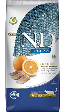 Сухой корм для кастрированных котов и стерилизованных кошек FARMINA N&D OCEAN NEUTERED беззерновой сельдь, апельсин (5 кг)