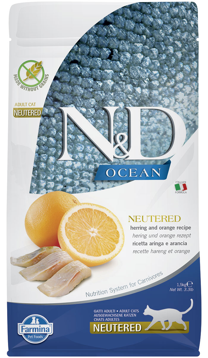 Сухой корм для кастрированных котов и стерилизованных кошек FARMINA N&D OCEAN NEUTERED беззерновой сельдь, апельсин (1,5 кг)