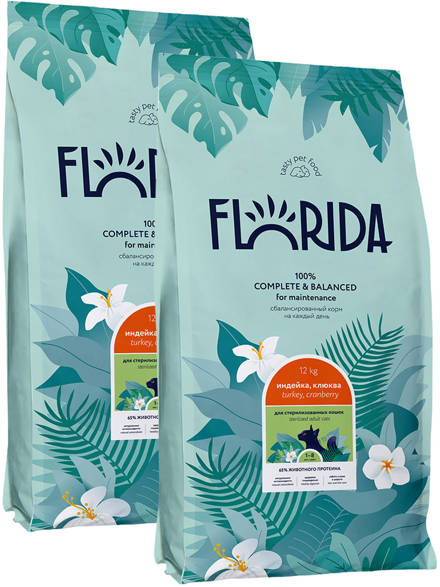 Сухой корм для кастрированных котов и стерилизованных кошек FLORIDA индейка, клюква (12 + 12 кг)