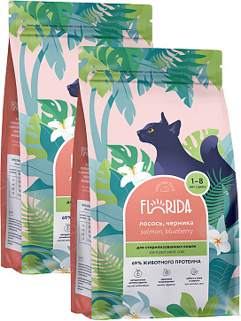 Сухой корм для кастрированных котов и стерилизованных кошек FLORIDA лосось, черника (0,4 + 0,4 кг)