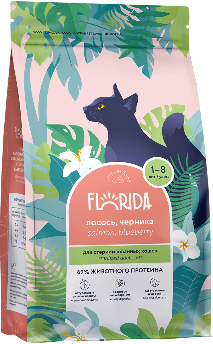 FLORIDA - сухой корм супер-премиум класса с лососем и черникой для кастрированных котов и стерилизованных кошек в возрасте от 1 до 8 лет.