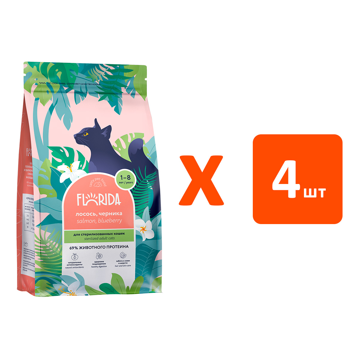 Сухой корм для кастрированных котов и стерилизованных кошек FLORIDA лосось, черника (0,4 кг х 4 шт)