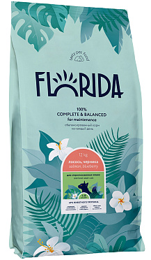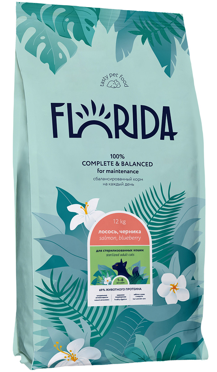 FLORIDA - сухой корм супер-премиум класса с лососем и черникой для кастрированных котов и стерилизованных кошек в возрасте от 1 до 8 лет.