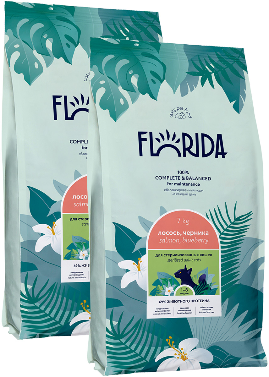 FLORIDA - сухой корм супер-премиум класса с лососем и черникой для кастрированных котов и стерилизованных кошек в возрасте от 1 до 8 лет.
