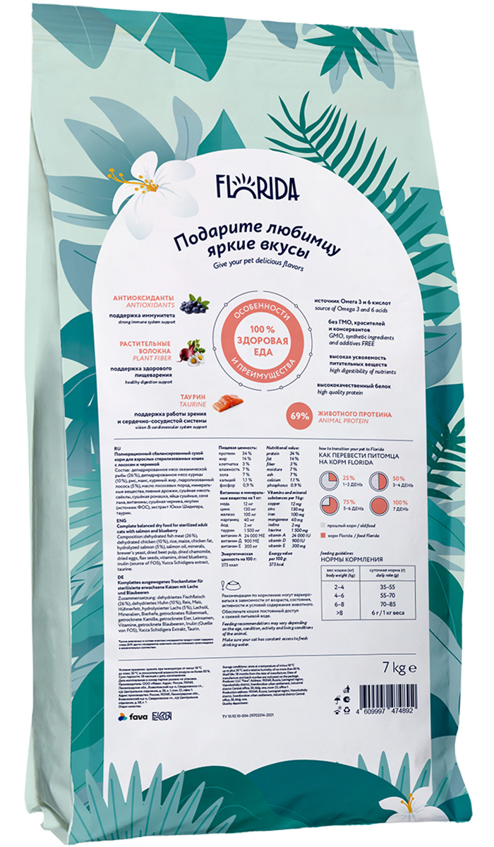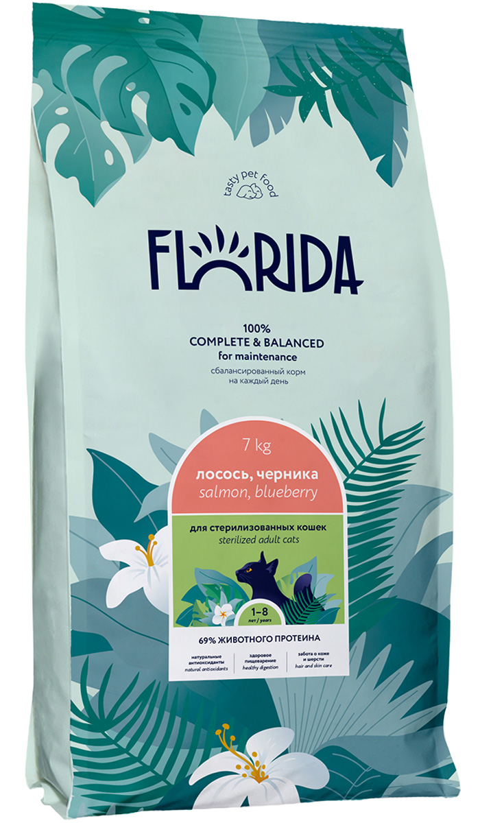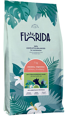 FLORIDA - сухой корм супер-премиум класса с лососем и черникой для кастрированных котов и стерилизованных кошек в возрасте от 1 до 8 лет.
