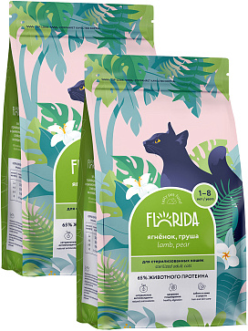 Сухой корм для кастрированных котов и стерилизованных кошек FLORIDA ягненок, груша (0,4 + 0,4 кг)