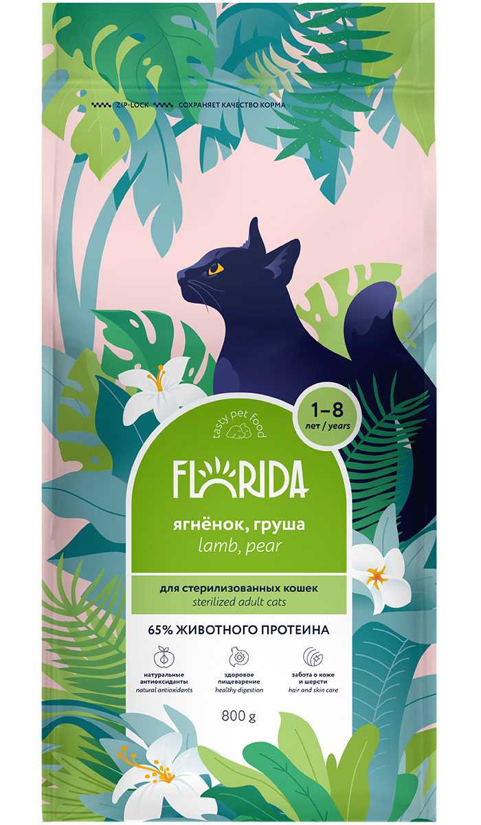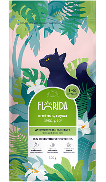 Сухой корм для кастрированных котов и стерилизованных кошек FLORIDA ягненок, груша (0,8 кг)