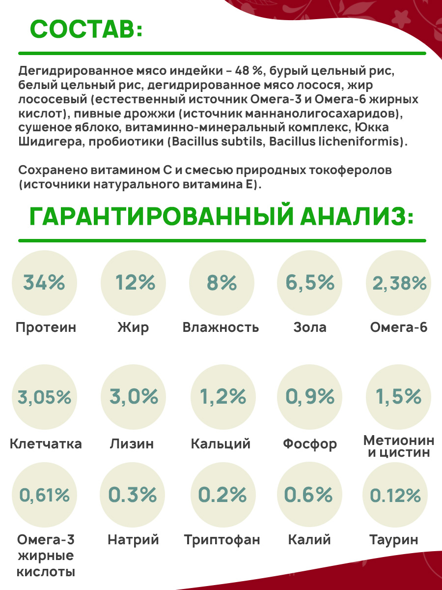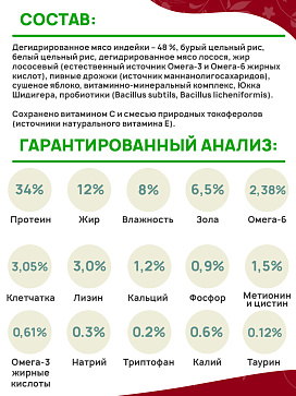 Состав: дегидрированное мясо 30% (индейка 15%, курица 15%), ячмень, концентрат растительного протеина, рис, жир животный, растительная клетчатка, гидролизованные мясные белки, витаминно-минеральный комплекс, рыбий жир (источник Омега-3), пивные дрожжи (источник МОС), свекольный жом, семя льна (источник Омега-3,6), DL-метионин, таурин, пробиотический комплекс, клюква, черника, экстракт Юкки Шидигера, яблоко, корень цикория (источник ФОС и инулина), L-карнитин, шиповник, ламинария. Сохранено экстрактом розмарина и природным токоферолом (витамин Е).