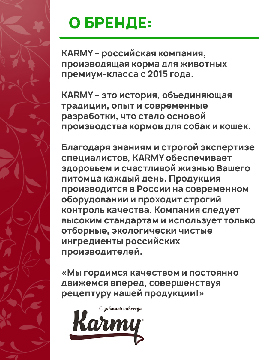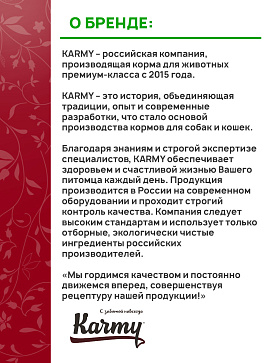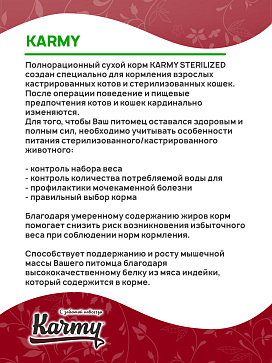 Полнорационный сухой корм KARMY STERILIZED предназначен для стерилизованных кошек и кастрированных котов старше 1 года. В зависимости от предпочтений вашей кошки корм можно давать сухим или увлажнённым.