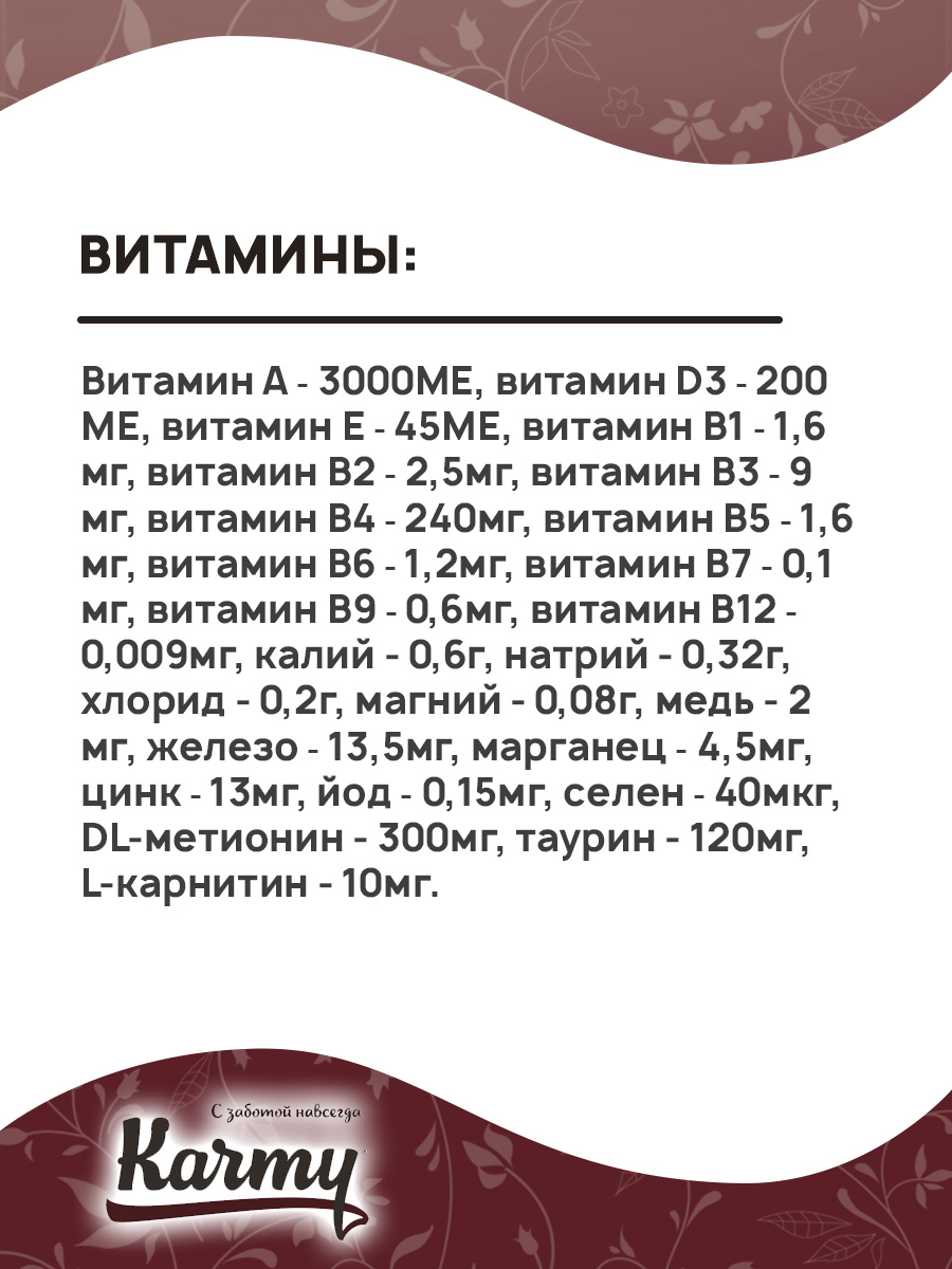 Витамин А ⎼ 3000МЕ, витамин D3 ⎼ 200МЕ, витамин Е ⎼ 45МЕ, витамин В1 ⎼ 1,6мг, витамин В2 ⎼ 2,5мг, витамин В3 ⎼ 9мг, витамин В4 ⎼ 240мг, витамин В5 ⎼ 1,6мг, витамин В6 ⎼ 1,2мг, витамин В7 ⎼ 0,1мг, витамин В9 ⎼ 0,6мг, витамин В12 ⎼ 0,009мг, калий - 0,6г, натрий - 0,32г, хлорид - 0,2г, магний - 0,08г, медь - 2мг, железо ⎼ 13,5мг, марганец ⎼ 4,5мг, цинк ⎼ 13мг, йод ⎼ 0,15мг, селен ⎼ 40мкг, DL-метионин - 300мг, таурин - 120мг, L-карнитин - 10мг.