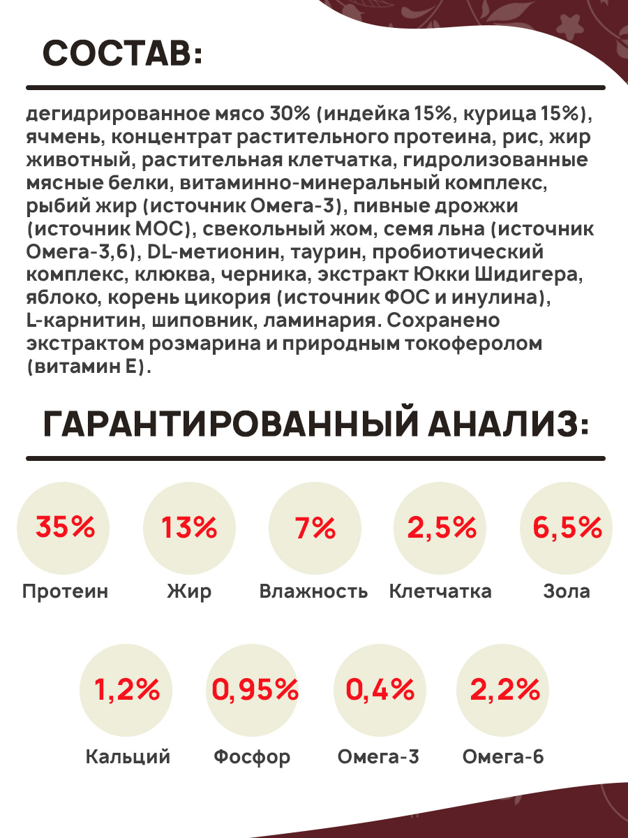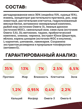 Состав: дегидрированное мясо 30% (индейка 15%, курица 15%), ячмень, концентрат растительного протеина, рис, жир животный, растительная клетчатка, гидролизованные мясные белки, витаминно-минеральный комплекс, рыбий жир (источник Омега-3), пивные дрожжи (источник МОС), свекольный жом, семя льна (источник Омега-3,6), DL-метионин, таурин, пробиотический комплекс, клюква, черника, экстракт Юкки Шидигера, яблоко, корень цикория (источник ФОС и инулина), L-карнитин, шиповник, ламинария. Сохранено экстрактом розмарина и природным токоферолом (витамин Е).
