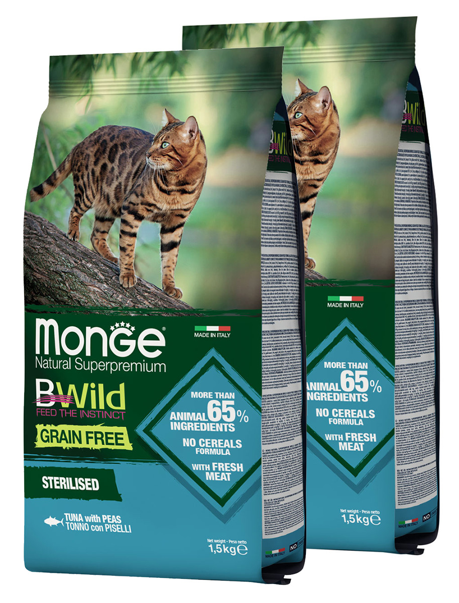 Сухой корм для кастрированных котов и стерилизованных кошек MONGE BWILD GRAIN FREE STERILISED беззерновой тунец, горох (1,5 + 1,5 кг)