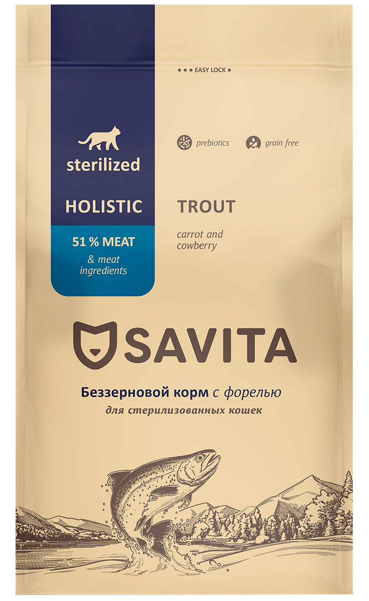 Сухой корм SAVITA STERILISED CATS TROUT класса холистик содержит высокий процент мясных ингредиентов, необходимых витаминов и минералов, без добавления зерновых культур в составе. Надолго обеспечивает кошку необходимой энергией на весь день. Каждый ингредиент тщательно подобран в соответствии с природными потребностями питомца и является важным компонентом в рецептуре корма, минимизируя риск возникновения аллергических реакций.