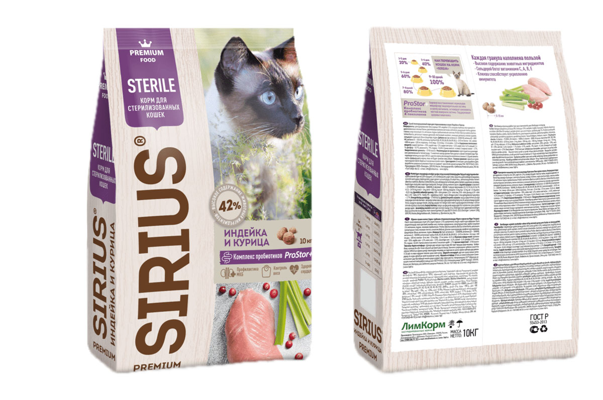 SIRIUS — сухой корм премиум-класса для полноценного ежедневного рациона кастрированных котов и стерилизованных кошек.