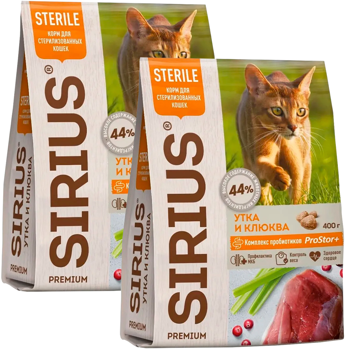 Сухой корм для кастрированных котов и стерилизованных кошек SIRIUS утка, клюква (0,4 + 0,4 кг)