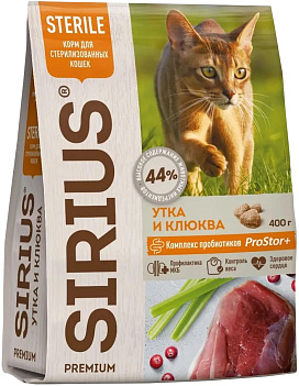 Сухой корм для кастрированных котов и стерилизованных кошек SIRIUS утка, клюква (0,4 кг)