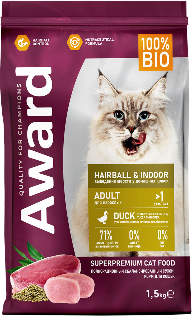 Сухой корм для кошек AWARD HAIRBALL & INDOOR утка (1,5 кг)