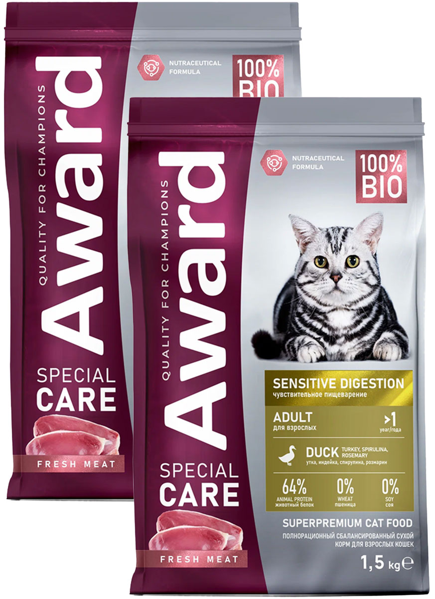 Сухой корм для кошек AWARD SPECIAL CARE SENSITIVE DIGESTION с чувствительным пищеварением утка (1,5 + 1,5 кг)