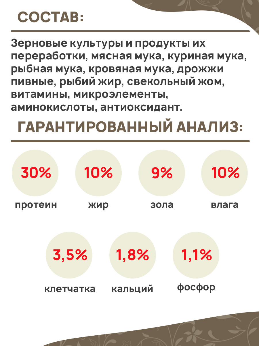 Зерновые культуры и продукты их переработки, мясная мука, куриная мука, рыбная мука, кровяная мука, дрожжи пивные, рыбий жир, свекольный жом, витамины, микроэлементы, аминокислоты, антиоксидант.