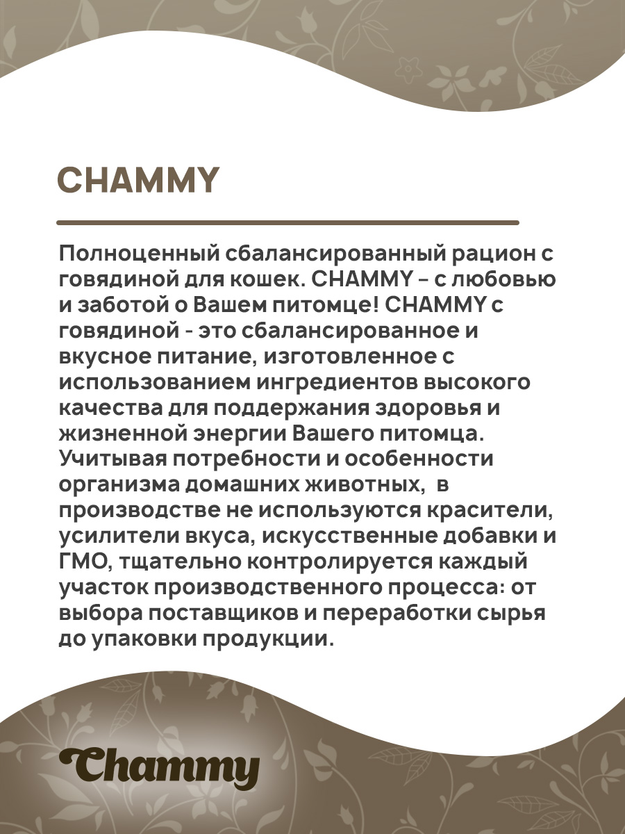 CHAMMY с говядиной - это сбалансированное и вкусное питание, изготовленное с использованием ингредиентов высокого качества для поддержания здоровья и жизненной энергии Вашего питомца.