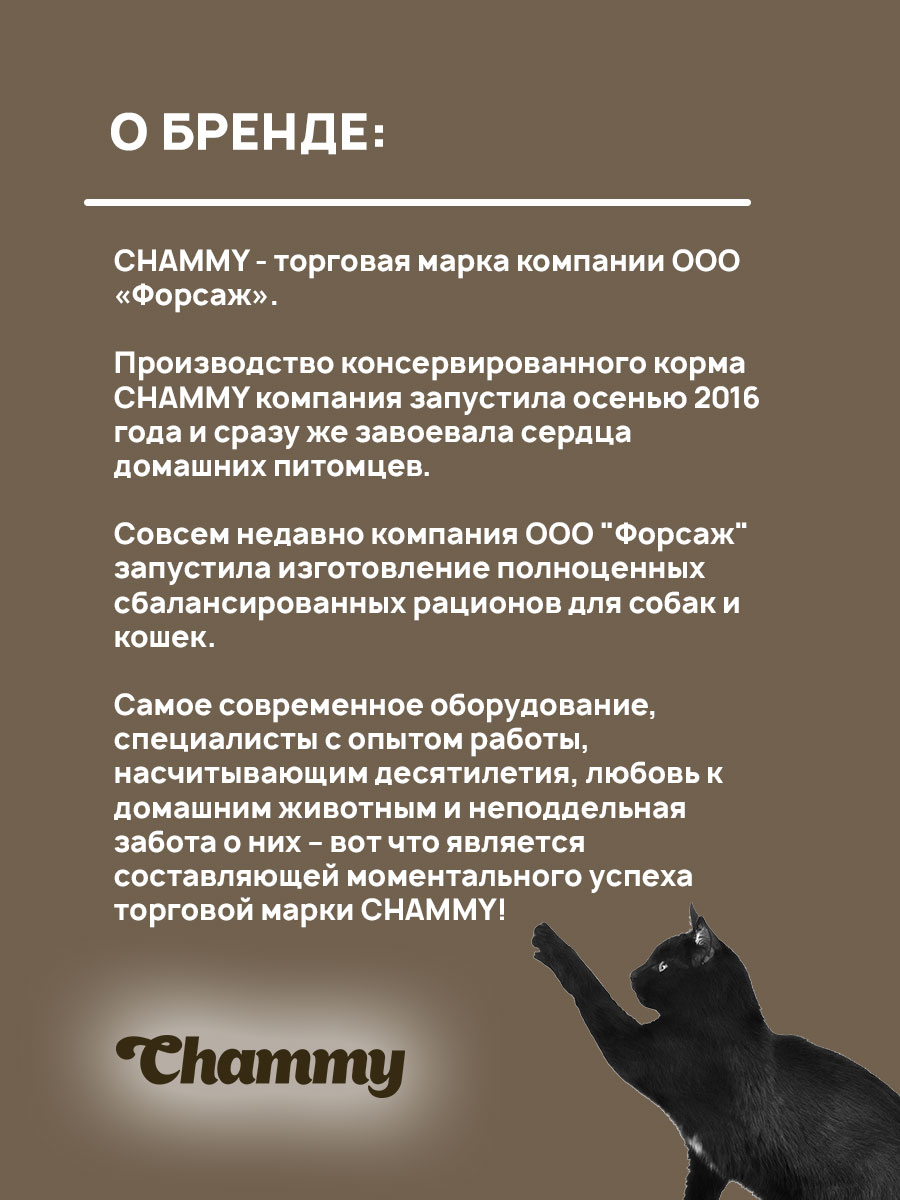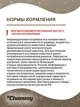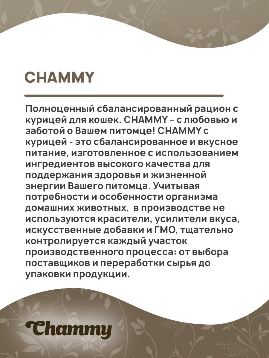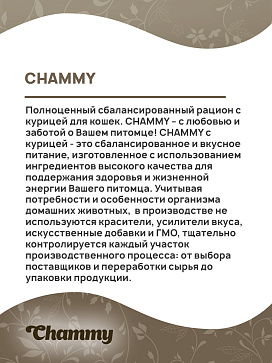 CHAMMY с курицей - это сбалансированное и вкусное питание, изготовленное с использованием ингредиентов высокого качества для поддержания здоровья и жизненной энергии Вашего питомца.