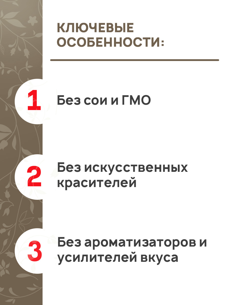 Учитывая потребности и особенности организма домашних животных, в производстве не используются красители, усилители вкуса, искусственные добавки и ГМО, тщательно контролируется каждый участок производственного процесса: от выбора поставщиков и переработки сырья до упаковки продукции.