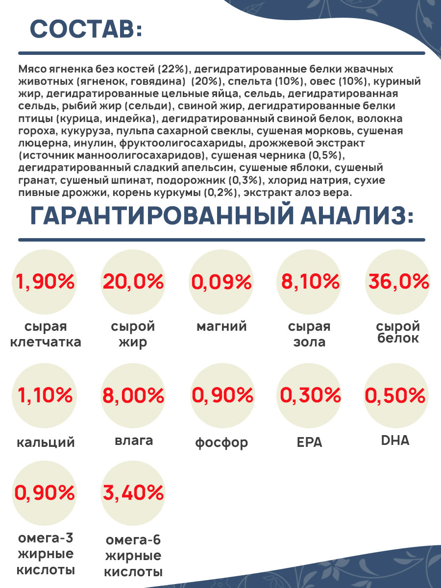 Мясо ягненка без костей (22%), дегидратированные белки жвачных животных (ягненок, говядина) (20%), спельта (10%), овес (10%), куриный жир, дегидратированные цельные яйца, сельдь, дегидратированная сельдь, рыбий жир (сельди), свиной жир, дегидратированные белки птицы (курица, индейка), дегидратированный свиной белок, волокна гороха, кукуруза, пульпа сахарной свеклы, сушеная морковь, сушеная люцерна, инулин, фруктоолигосахариды, дрожжевой экстракт (источник маннoолигосахаридов), сушеная черника (0,5%), дегидратированный сладкий апельсин, сушеные яблоки, сушеный гранат, сушеный шпинат, подорожник (0,3%), хлорид натрия, сухие пивные дрожжи, корень куркумы (0,2%), экстракт алоэ вера.