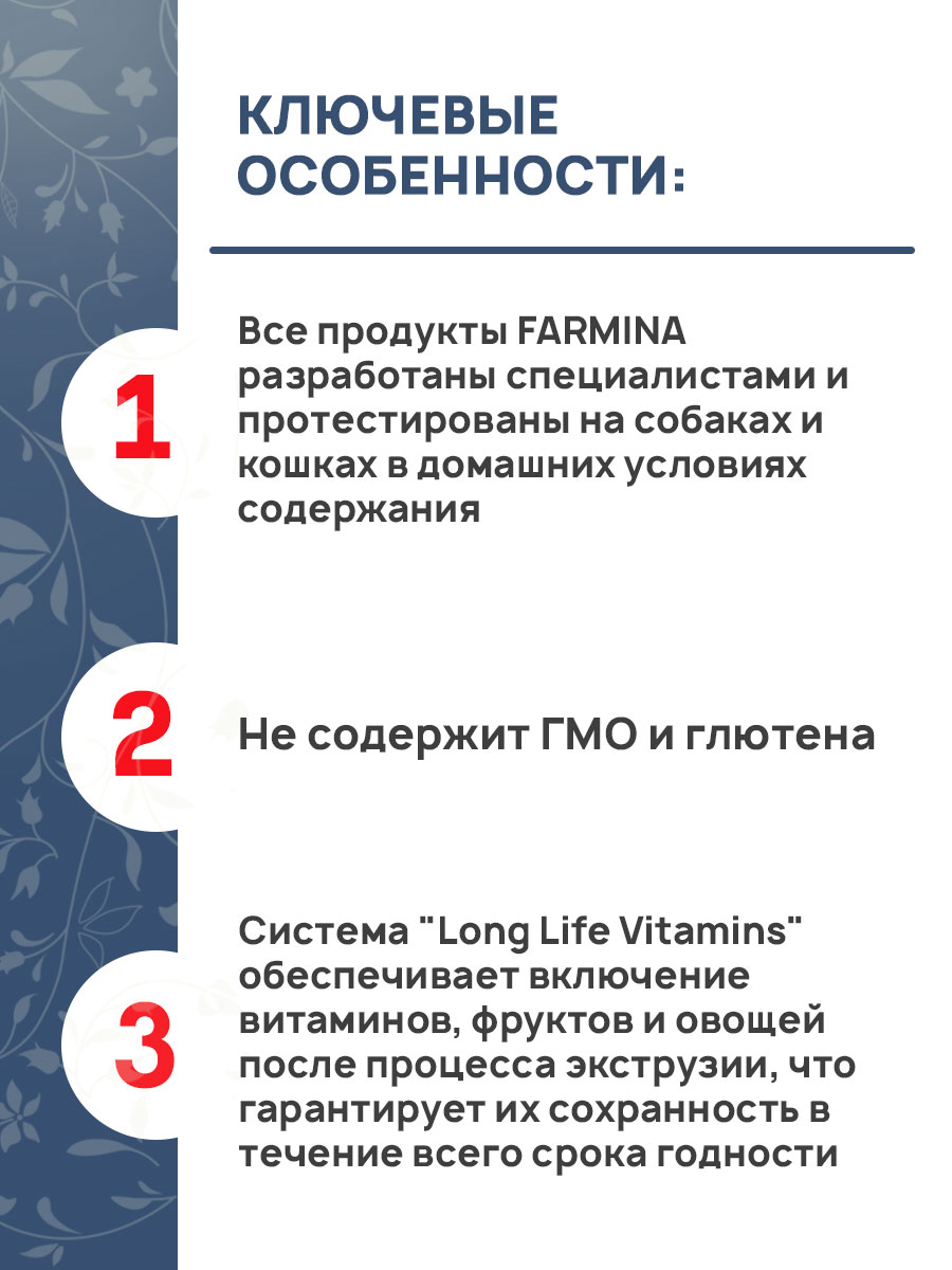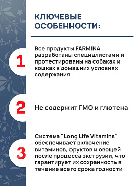 - Все продукты FARMINA разработаны специалистами и протестированы на собаках и кошках в домашних условиях содержания.