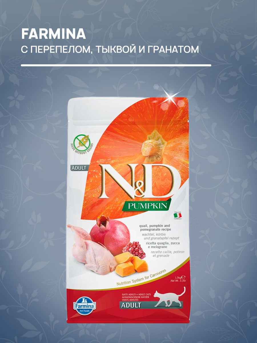 Понимание хищной природы наших четвероногих членов семьи послужило началом для ряда научных исследований по разработке и улучшению качества кормов, в соответствии с естественным рационом животных. Кошки в естественной среде обитания предпочитают мясо. Следуя этой философии, FARMINA разработала инновационную линейку N&D Pumpkin Formula. Это линейка беззерновых кормов с высоким содержанием ингредиентов животного происхождения (более 60 %) и тыквой, овощем с превосходными питательными свойствами.
