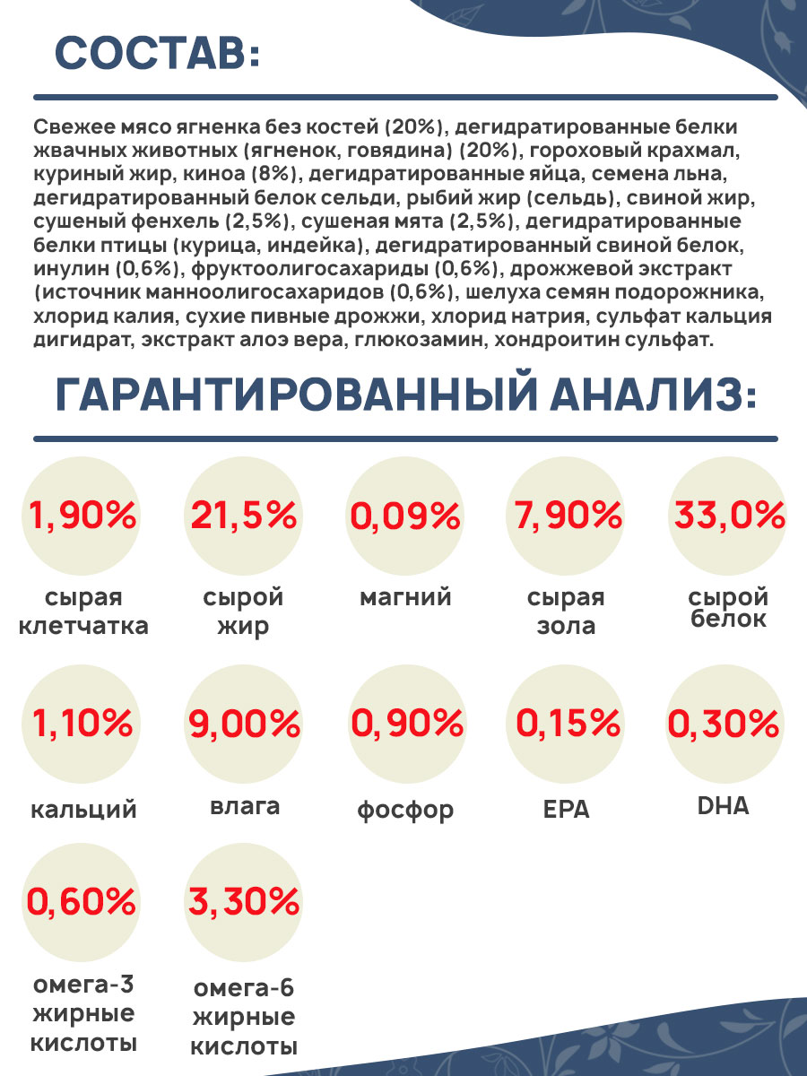 Свежее мясо ягненка без костей (20%), дегидратированные белки жвачных животных (ягненок, говядина) (20%), гороховый крахмал, куриный жир, киноа (8%), дегидратированные яйца, семена льна, дегидратированный белок сельди, рыбий жир (сельдь), свиной жир, сушеный фенхель (2,5%), сушеная мята (2,5%), дегидратированные белки птицы (курица, индейка), дегидратированный свиной белок, инулин (0,6%), фруктоолигосахариды (0,6%), дрожжевой экстракт (источник манноолигосахаридов (0,6%), шелуха семян подорожника, хлорид калия, сухие пивные дрожжи, хлорид натрия, сульфат кальция дигидрат, экстракт алоэ вера, глюкозамин, хондроитин сульфат.