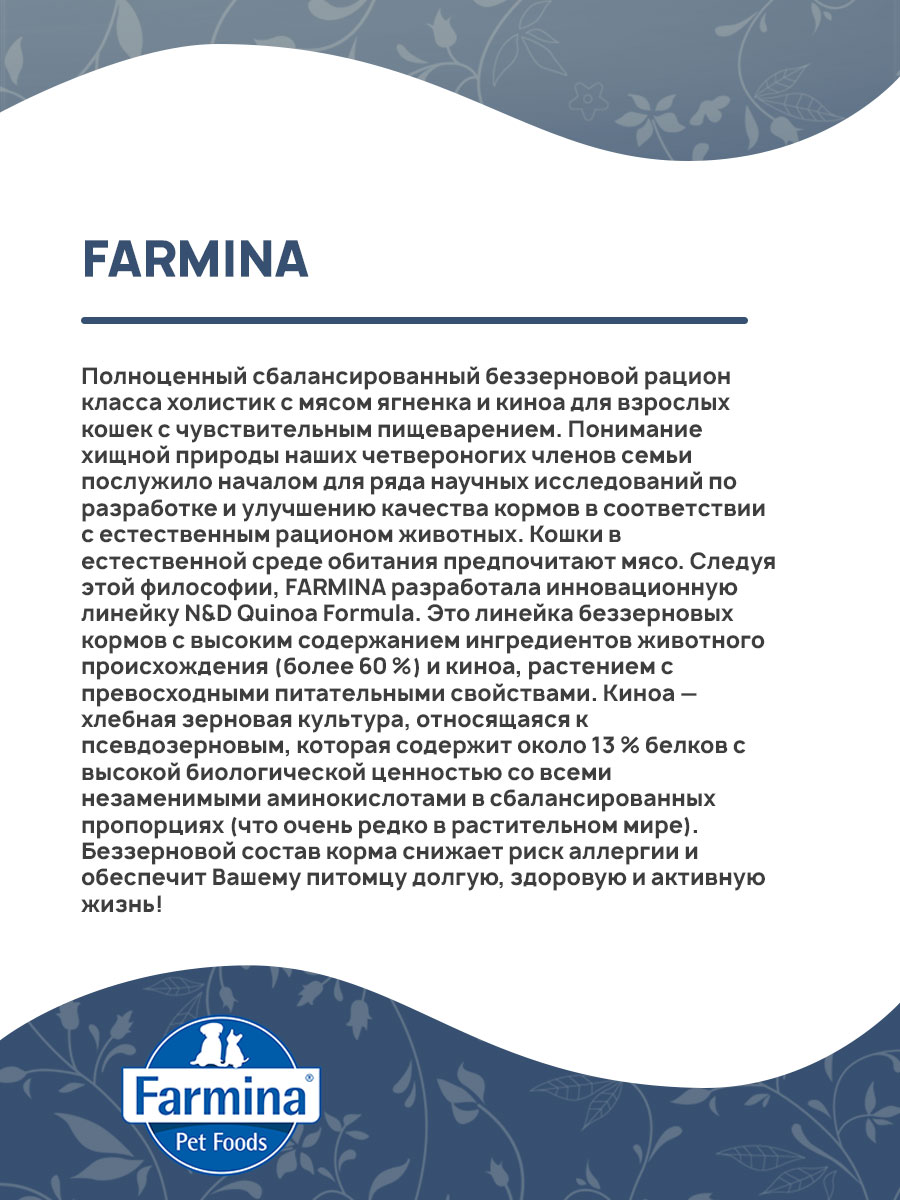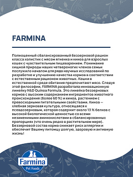 Понимание хищной природы наших четвероногих членов семьи послужило началом для ряда научных исследований по разработке и улучшению качества кормов в соответствии с естественным рационом животных. Кошки в естественной среде обитания предпочитают мясо. Следуя этой философии, FARMINA разработала инновационную линейку N&D Quinoa Formula. Это линейка беззерновых кормов с высоким содержанием ингредиентов животного происхождения (более 60 %) и киноа, растением с превосходными питательными свойствами. Киноа — хлебная зерновая культура, относящаяся к псевдозерновым, которая содержит около 13 % белков с высокой биологической ценностью со всеми незаменимыми аминокислотами в сбалансированных пропорциях (что очень редко в растительном мире).