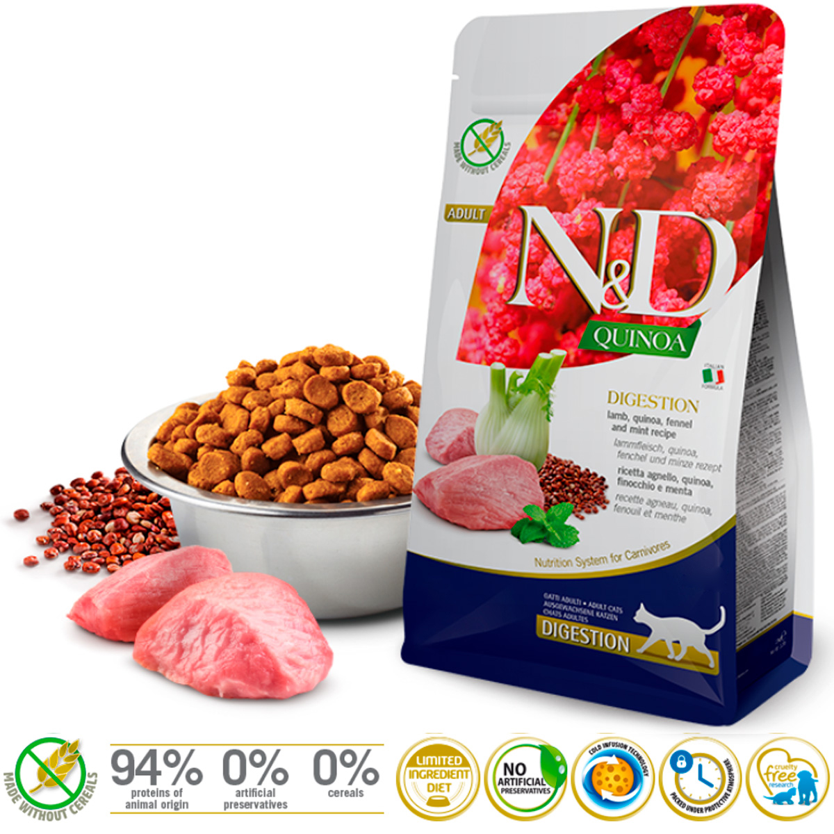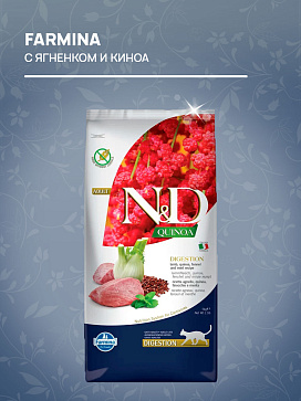 FARMINA CAT N&D GRAIN FREE QUINOA DIGESTION LAMB - уникальная формула для здоровья кишечника Вашего питомца. В состав корма входит: Фенхель: способствует поглощению питательных веществ и уменьшает ферментацию. Является источником флавоноидов, которые обеспечивают антиоксидантное действие. Мята: стимулирует желудочную активность, которая способствует пищеварению. Также обладает спазмолитическим и усиливающим эффектом.