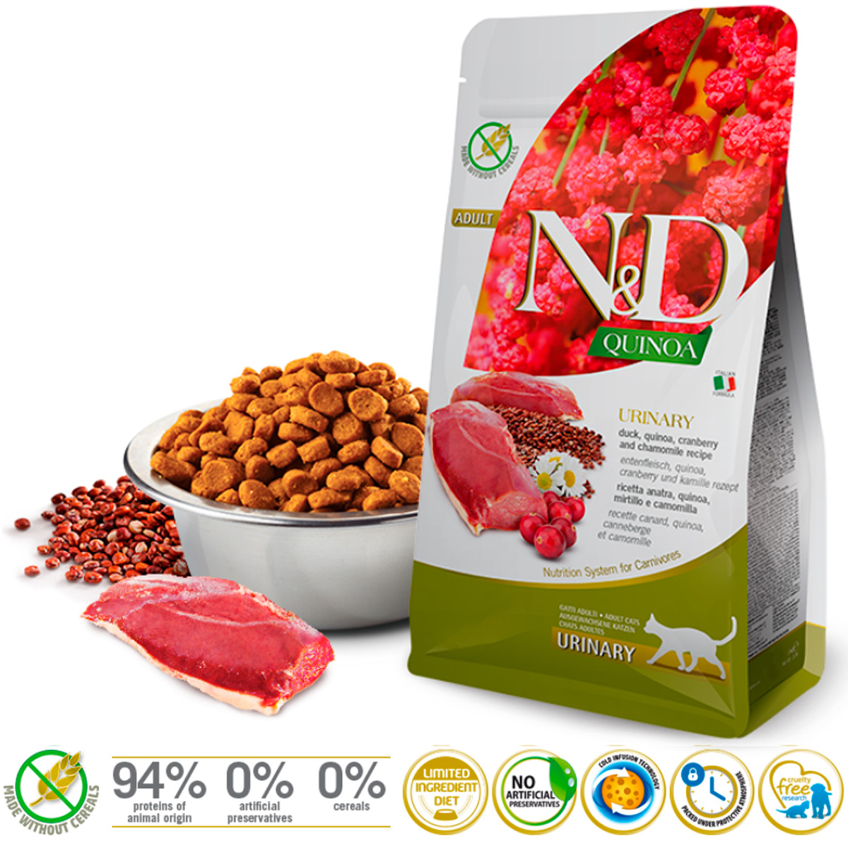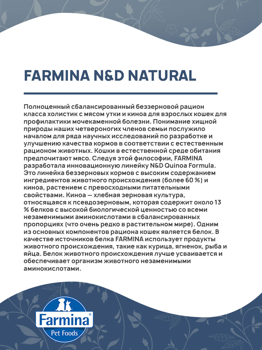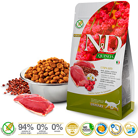 FARMINA CAT N&D GRAIN FREE QUINOA URINARY DUCK - уникальная формула для восстановления мочевых путей и предотвращения мочекаменной болезни. В состав корма входит: Клюква: богата витаминами А и С. Способствует здоровью желудочно-кишечного тракта. Помогает регулировать уровень глюкозы в крови. Ромашка: обладает противовоспалительным и успокаивающим воздействием на организм. Содержание флавоноидов делает ромашку очень полезной в пищеварении. Ромашка незаменима для профилактики болезней сердечно-сосудистой системы.