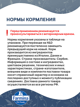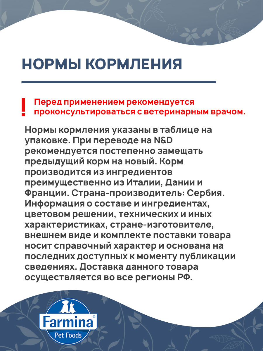 Рекомендации по кормлению: Нормы кормления указаны в таблице на упаковке. При переводе на N&D рекомендуется постепенно замещать предыдущий корм на новый. Корм производится из ингредиентов преимущественно из Италии, Дании и Франции.