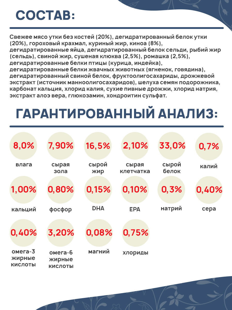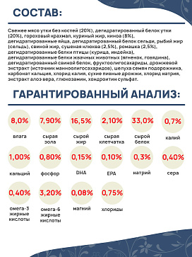 Свежее мясо утки без костей (20%), дегидратированный белок утки (20%), гороховый крахмал, куриный жир, киноа (8%), дегидратированные яйца, дегидратированный белок сельди, рыбий жир (сельдь), свиной жир, сушеная клюква (2,5%), ромашка (2,5%), дегидратированные белки птицы (курица, индейка), дегидратированные белки жвачных животных (ягненок, говядина), дегидратированный свиной белок, фруктоолигосахариды, дрожжевой экстракт (источник манноолигосахаридов), шелуха семян подорожника, карбонат кальция, хлорид калия, сухие пивные дрожжи, хлорид натрия, экстракт алоэ вера, глюкозамин, хондроитин сульфат.