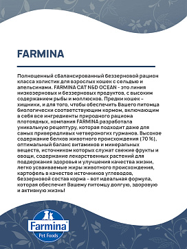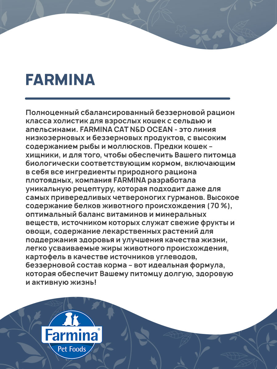 FARMINA CAT N&D OCEAN - это линия низкозерновых и беззерновых продуктов, с высоким содержанием рыбы и моллюсков.