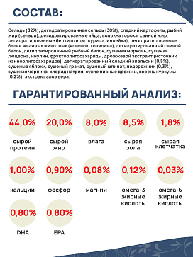 Сельдь (32%), дегидратированная сельдь (30%), сладкий картофель, рыбий жир (сельди), дегидратированные яйца, волокна гороха, свиной жир, дегидратированные белки птицы (курица, индейка), дегидратированные белки жвачных животных (ягненок, говядина), дегидратированный свиной белок, дегидратированный рыбный белок, сушеная морковь, сушеная люцерна, инулин, фруктоолигосахариды, дрожжевой экстракт (источник маннoолигосахаридов), дегидратированный сладкий апельсин (0,5%), сушеные яблоки, сушеный гранат, сушеный шпинат, подорожник (0,3%), сушеная черника, хлорид натрия, сухие пивные дрожжи, корень куркумы (0,2%), экстракт алоэ вера.