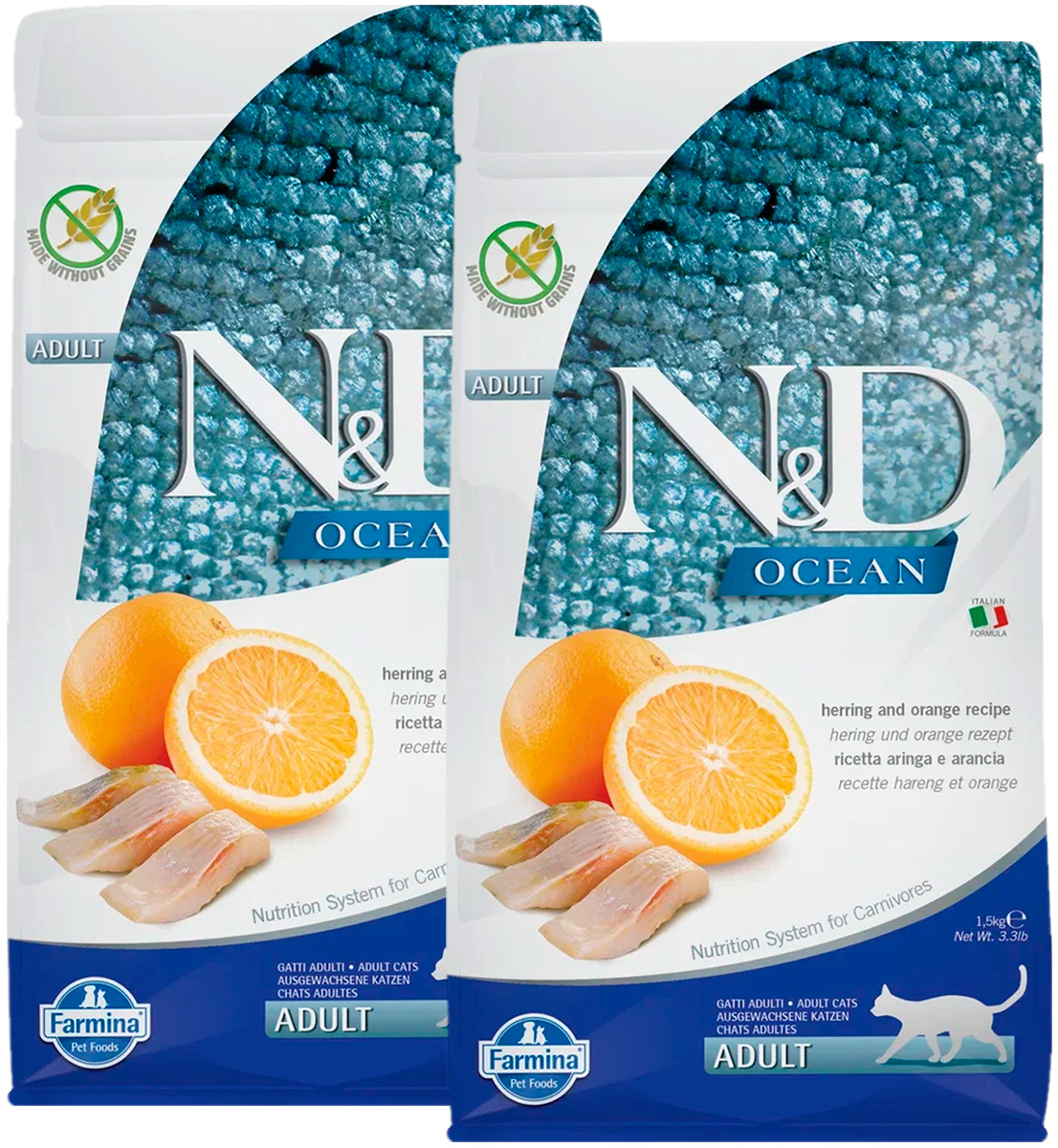Сухой корм для кошек FARMINA N&D OCEAN беззерновой сельдь, апельсин (1,5 + 1,5 кг)