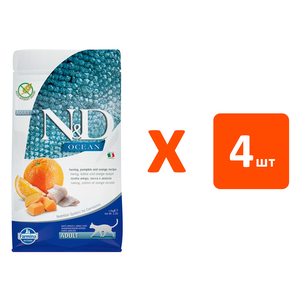 Сухой корм для кошек FARMINA N&D OCEAN беззерновой сельдь, тыква, апельсин (1,5 кг х 4 шт)