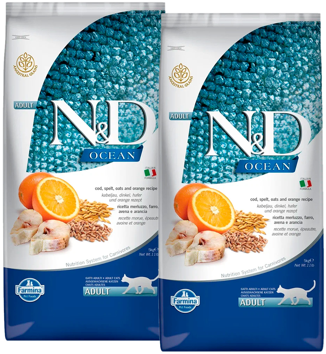 Сухой корм для кошек FARMINA N&D OCEAN низкозерновой треска, спельта, овес, апельсин (5 + 5 кг)