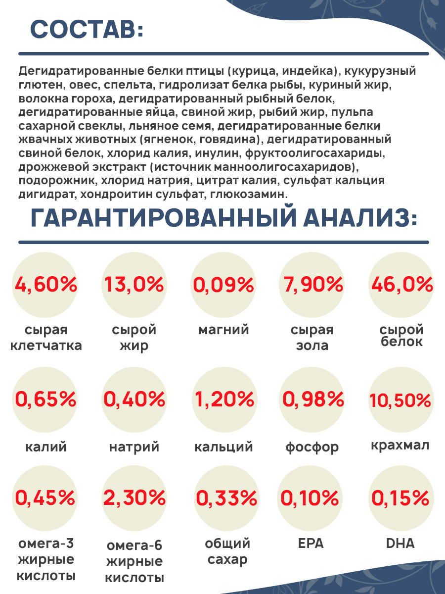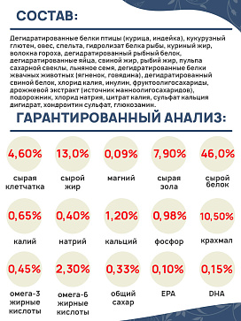 Дегидратированные белки птицы (курица, индейка), кукурузный глютен, овес, спельта, гидролизат белка рыбы, куриный жир, волокна гороха, дегидратированный рыбный белок, дегидратированные яйца, свиной жир, рыбий жир, пульпа сахарной свеклы, льняное семя, дегидратированные белки жвачных животных (ягненок, говядина), дегидратированный свиной белок, хлорид калия, инулин, фруктоолигосахариды, дрожжевой экстракт (источник манноолигосахаридов), подорожник, хлорид натрия, цитрат калия, сульфат кальция дигидрат, хондроитин сульфат, глюкозамин.