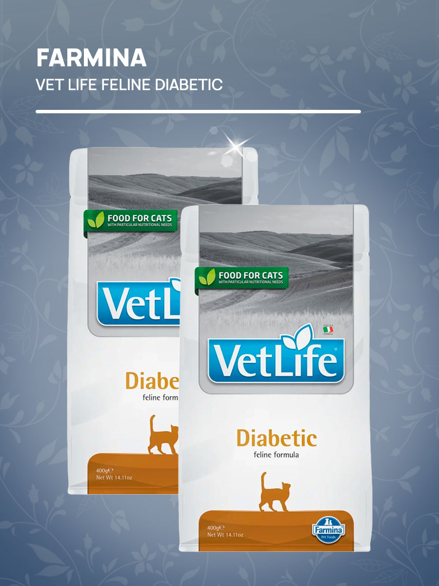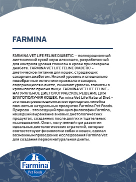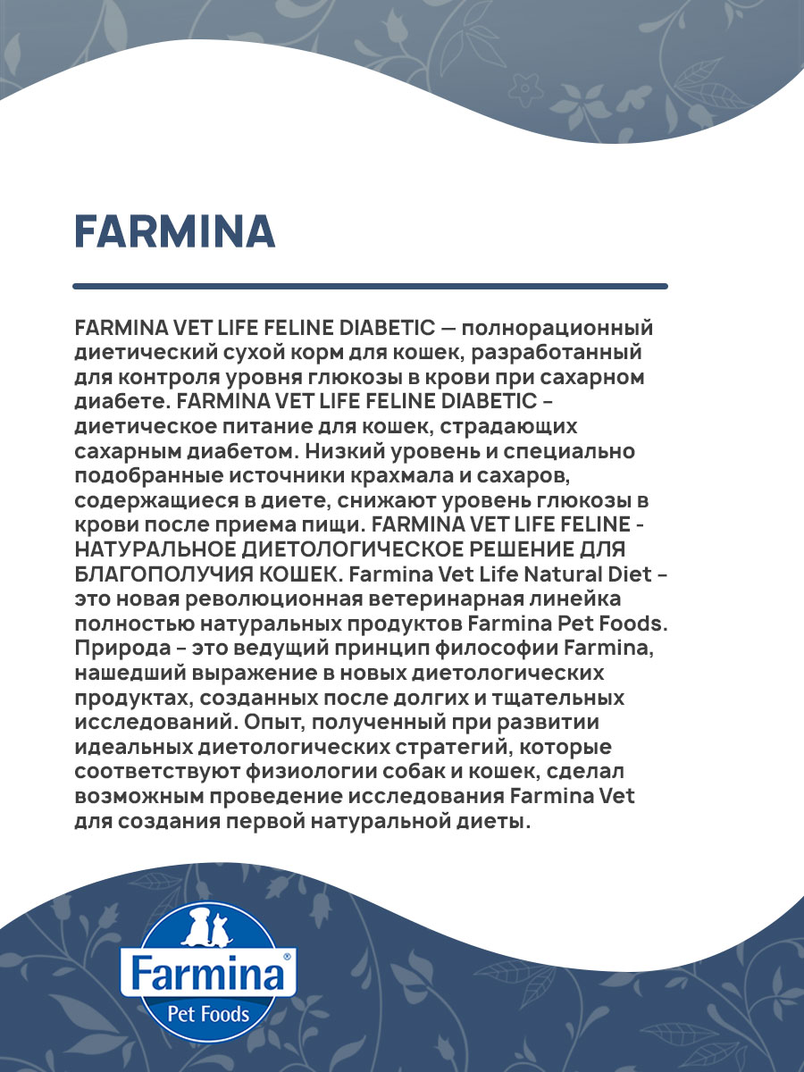 FARMINA VET LIFE FELINE DIABETIC – диетическое питание для кошек, страдающих сахарным диабетом. Низкий уровень и специально подобранные источники крахмала и сахаров, содержащиеся в диете, снижают уровень глюкозы в крови после приема пищи.
