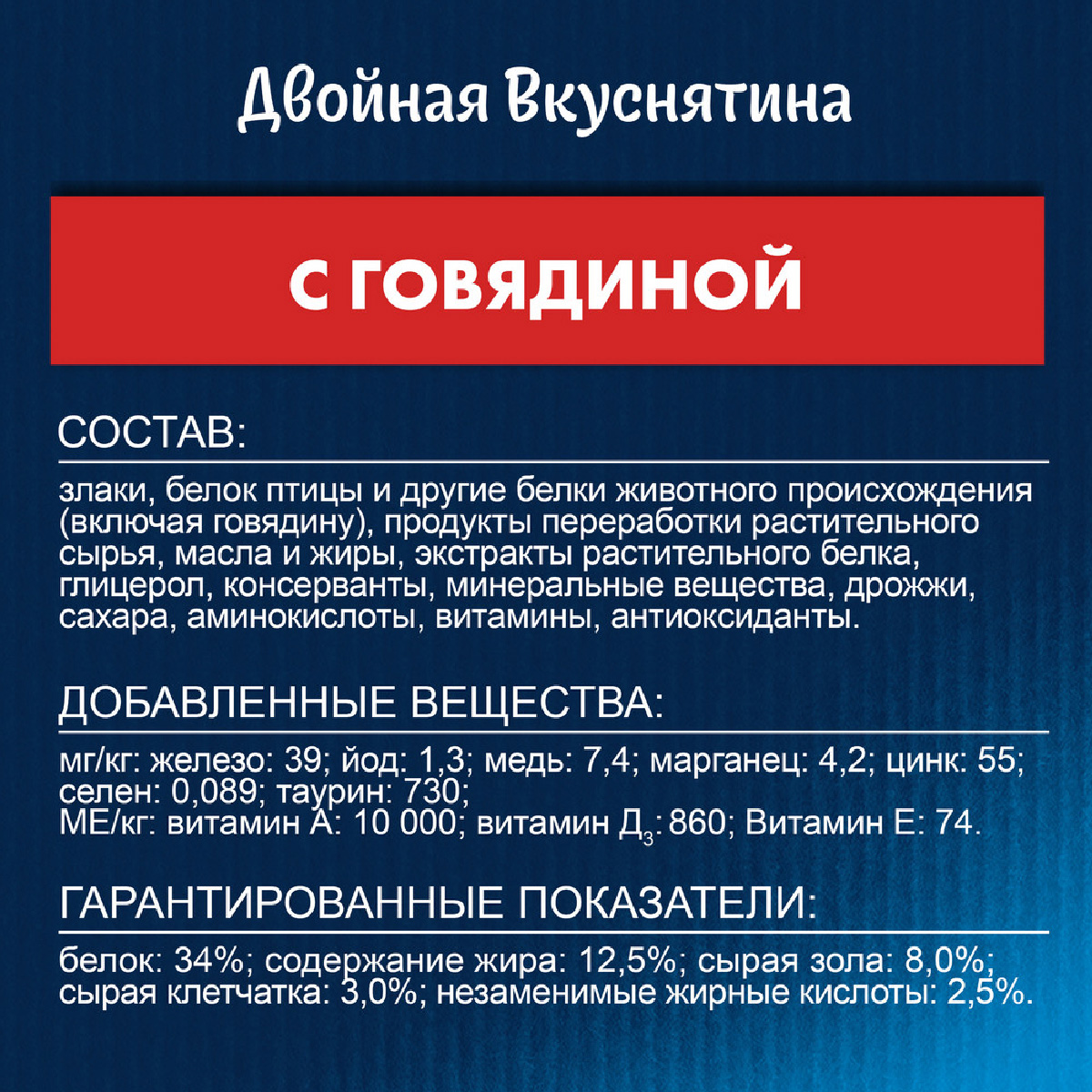 Состав: злаки, белок птицы и другие белки животного происхождения (включая говядину), продукты переработки растительного сырья, масла и жиры, экстракты растительного белка, глицерол, консерванты, минеральные вещества, дрожжи, сахара, аминокислоты, витамины, антиоксиданты.
